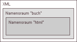 Das Beispiel zeigt ein XML-Dokument. Es enthält ein Dokument-Element namens buch. In dessen Einleitungs-Tag ist eine XML-Namensraumdeklaration enthalten. Dazu wird in dem einleitenden Tag das Attribut xmlns notiert (xmlns = XML name space, also XML-Namensraum). Dahinter folgt ein Seite URI, der angibt, auf welchen anderen Namensraum in diesem Element Bezug genommen wird. Dieser URI muss nicht unbedingt eine tatsächlich aufrufbare Adresse sein. Es handelt sich um eine reine Konvention, vergleichbar einer eindeutigen Namensvergabe. Bei eigenen XML-Sprachen können Sie diese Adressen selbst vergeben. Im Beispiel wird http://www.meinserver.de/XML/buch gewählt. Das buch-Element selbst und seine untergeordneten Elemente (Kindelemente) - z.B. das Element kapitel - beziehen sich nun auf den definierten Namensraum. Unterhalb des kapitel-Elements ist im Beispiel jedoch wieder ein Element mit Namensraumdeklaration enthalten: ein html-Element mit xmlns-Attribut. Im Fall von HTML 4.0 sieht das W3-Konsortium dazu die Angabe http://www.w3.org/TR/REC-html-40 vor. Alle Kindelemente, die nun zwischen <html> und </html> stehen, gehören zum HTML-Namensraum (oder: zur HTML-Dateninsel).